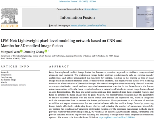 2025年5月23日,我校william威廉英国张旭明副教授在信息融合领域顶级期刊《Information Fusion》上发表了题为“LPM-Net: Lightweight pixel-level modeling network based on CNN and Mamba for 3D medical image fusion”的研究论文。