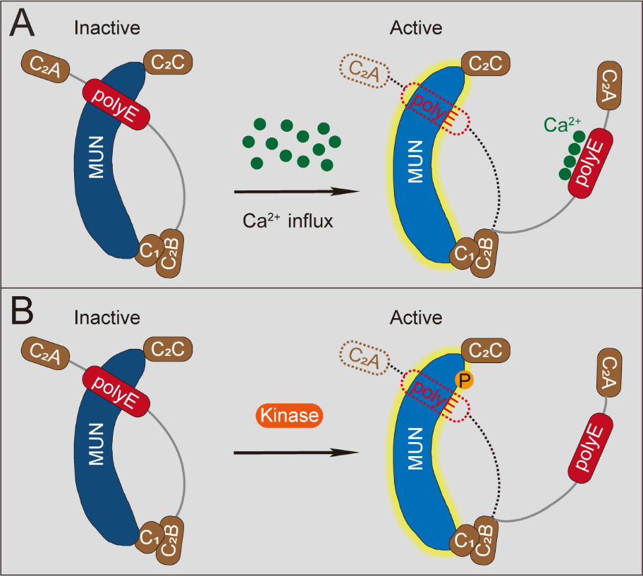 图2 Munc13-1借助于polyE结构域通过钙离子和磷酸化双重机制调控活性