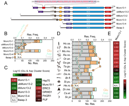 研究中通过序列分析发现,恒温动物Munc13-1分子内靠近氨基末端的区域富集了大量谷氨酸及天冬氨酸等负电荷氨基酸,这一特征在两栖类动物(如爪蟾等)Munc13-1分子中已经开始存在少量的富集,而在其他Munc13亚型及低等生物中均不存在,暗示这一特征序列起源自两栖类生物,并在恒温动物中保留下来,可能在高等神经活动中发挥重要作用,将其命名为polyE结构域。实验发现polyE结构域通过分子内相互作用与Munc13-1的核心催化结构域MUN结合,并抑制Munc13-1催化SNARE复合物组装的活性,使Munc13-1处于自抑制构象。