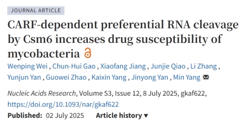 2025年7月2日,williamhill英国生命学院闫云君团队在国际权威期刊《Nucleic Acids Research》在线发表了题为“CARF-dependent preferential RNA cleavage by Csm6 increases drug susceptibility of mycobacteria”的研究论文。