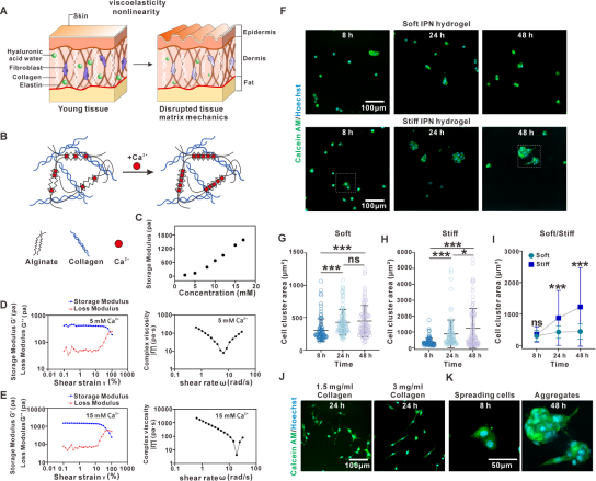 该论文应用海藻酸盐-胶原蛋白互穿网络(IPN)水凝胶系统,构建了同时具有非线弹性生物基质和粘弹性生物基质的"组织力学仿生水凝胶"。这种创新设计巧妙地结合了胶原蛋白网络提供的非线性弹性特征和海藻酸盐网络展现的粘弹性剪切变稀行为。通过调节钙离子交联浓度,研究团队能够在保持胶原蛋白和海藻酸盐浓度一致的情况下,精确控制水凝胶的初始储存模量,从而模拟不同年龄组织的力学特性。
