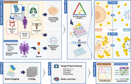 循环肿瘤细胞(CTCs)和小细胞外囊泡(sEVs)来源于七种癌细胞系与两种正常细胞系,并收集了包含乳腺癌四个分型(Luminal A/B、HER2+、三阴性乳腺癌)、乳腺结节及健康对照的临床样本(n = 72)。CTCs 和 sEVs 与三种不同尺寸的金纳米颗粒(AuNPs)混合,经冻融处理后形成特征性 FTFPA 图案。随后通过智能手机及自动化成像平台采集图像,并输入深度学习模型进行分析,实现癌症亚型分类与预测。