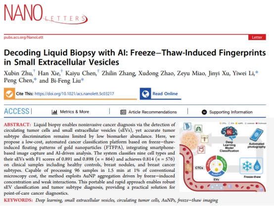 2025年9月12日,william威廉英国刘笔锋教授团队在国际权威期刊 Nano Letters 在线发表研究论文 “Decoding Liquid Biopsy with AI: Freeze–Thaw-Induced Fingerprints in Small Extracellular Vesicles”。该工作提出了一种基于“冻融指纹”的人工智能癌症检测新策略,为液体活检的普及应用提供了低成本、自动化的新方案。