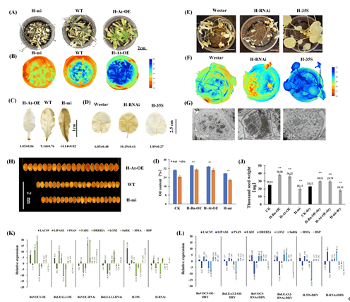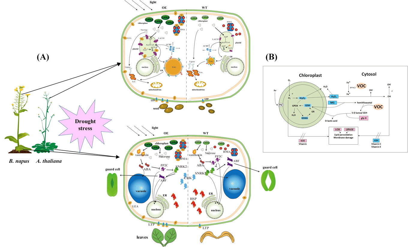 LEA作为一个小分子蛋白,在非生物胁迫中可起到稳定细胞膜结构和中和因胁迫脱水而增加的离子的作用,从而使得细胞内的胞内渗透压环境保持稳定。甲基乙二醛(methylglyoxal,MG)是碳水化合物和油脂新陈代谢过程中产生的有害副产物,VOC基因主要编码蛋白为甲基乙二醛酶I(Glyoxalase I ,GLYI),其可在谷胱甘肽的作用下可以对MG起到降解和转化,从而帮助植物应对非生物胁迫。在这项最新的研究中,栗茂腾教授研究团队首先从甘蓝型油菜(AACC,2n=38)克隆了干旱胁迫相关基因BnLEA和BnVOC各4个拷贝,以及拟南芥同源的AtLEA与AtVOC基因,并分别构建了种子特异表达启动子和CaMV35S启动子的超表达载体;结果显示在拟南芥中超表达LEA和VOC基因的转基因后代不仅抗旱性增强,而且种子含油量也有了显著提高。同时,种子千粒重也有所提高;而拟南芥atlea3突变体和AtVOC基因的RNA干扰后代在干旱胁迫下的抗旱性和含油量则均明显下降,突变体遗传回补则可明显使抗旱性和含油量表型回补。热成像与显微切片结果显示,atlea3与AtVOC-RNA干扰后代的种子发育和叶表形态温度等均会受到干旱影响。同时,在甘蓝型油菜中也进行了多个拷贝的BnLEA与BnVOC的超表达载体、BnLEA与BnVOC的RNA干扰载体进行了遗传转化,在转基因后代出现了相应的抗旱性与含油量的表型。并且,相比于正常生长栽培环境,在干旱胁迫的情况下,LEA与VOC基因的对含油量对作用效果更为显著。为进一步验证LEA与VOC基因的功能,对单基因的拟南芥和甘蓝型油菜转基因后代均进行了杂交,包括正向调控株系和反向调控株系。相比于单基因的转基因后代,杂交后代的含油量表型变化更为显著。这说明作用机制不同的干旱胁迫响应基因均可对植物油脂的积累产生影响。