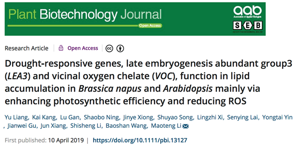 4月10日,我院栗茂腾教授课题组在国际植物学领域知名期刊Plant Biotechnology Journal在线发表了题为Drought responsive genes, late embryogenesis abundant group3 (LEA3) and vicinal oxygen chelate (VOC), function in lipid accumulation in Brassica napus and Arabidopsis mainly via enhancing photosynthesis efficiency and reducing ROS的研究论文。本文揭示了干旱胁迫基因LEA与VOC可通过提高光合效率,降低活性氧对植物细胞的伤害,从而保证了干旱情况下甘蓝型油菜与拟南芥中含油量的稳定,以及提高了正常环境下种子中油脂的积累。