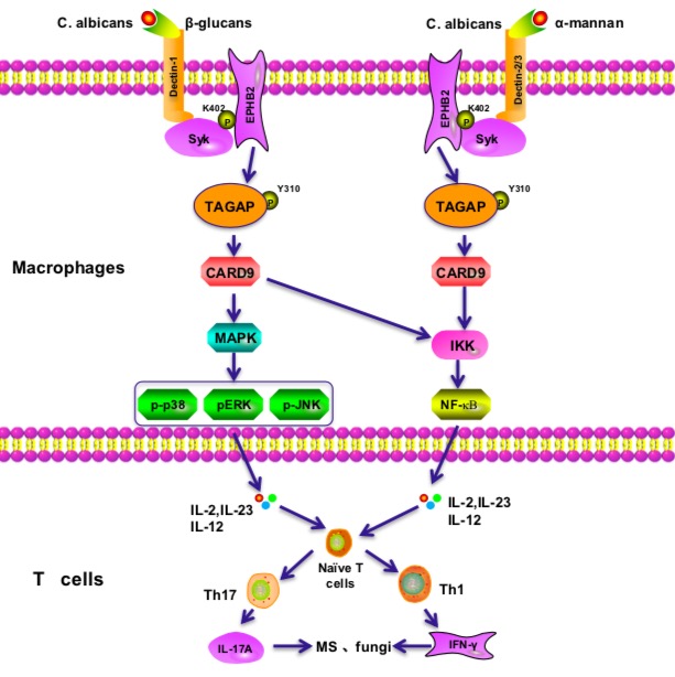 作者研究发现了在TAGAP敲除的巨噬细胞中,由Dectin-1、Dectin-2/3及Mincle配体介导的MAPK和NF-kB信号通路发生缺陷,该结果验证了TAGAP在抗真菌免疫中发挥了重要功能。通过进一步的分子机制研究,作者发现在Dectin-1/2/3Syk-CBM复合体诱导的NF-κB/MAPK经典抗真菌免疫信号通路中,上游分子Syk磷酸化受体酪氨酸激酶EPHB2。 随后,磷酸化的EPHB2分子进一步磷酸化TAGAP的第310位酪氨酸位点。磷酸化的TAGAP招募下游信号分子CARD9,从而激活NF-κB/MAPK信号通路,并介导了IL-2, IL-12以及IL-23等相关炎症因子的表达。特定细胞因子如IL-23、IL-6等促进T细胞分化为Th17细胞并介导真菌的清除。TAGAP缺陷或者由于TAGAP基因变异造成的表达降低会导致抗真菌信号通路激活异常以及细胞因子分泌减少,从而导致Th17细胞分化异常,并导致真菌血症易感(Fig 1)。另外,我们也通过小鼠实验发现相对于对照野生型小鼠,TAGAP敲除小鼠对白色念珠菌感染引起的体重减轻更快,致死率更高,从而进一步从动物整体水平证实了TAGAP在抗真菌免疫中发挥了重要的作用。本研究不仅阐明了TAGAP在抗真菌免疫中的分子机制以及功能,同时也初步探索了抗真菌免疫异常导致自身免疫疾病易感的机制,并为自身免疫疾病如多发性硬化症的治疗提供了靶点和线索。