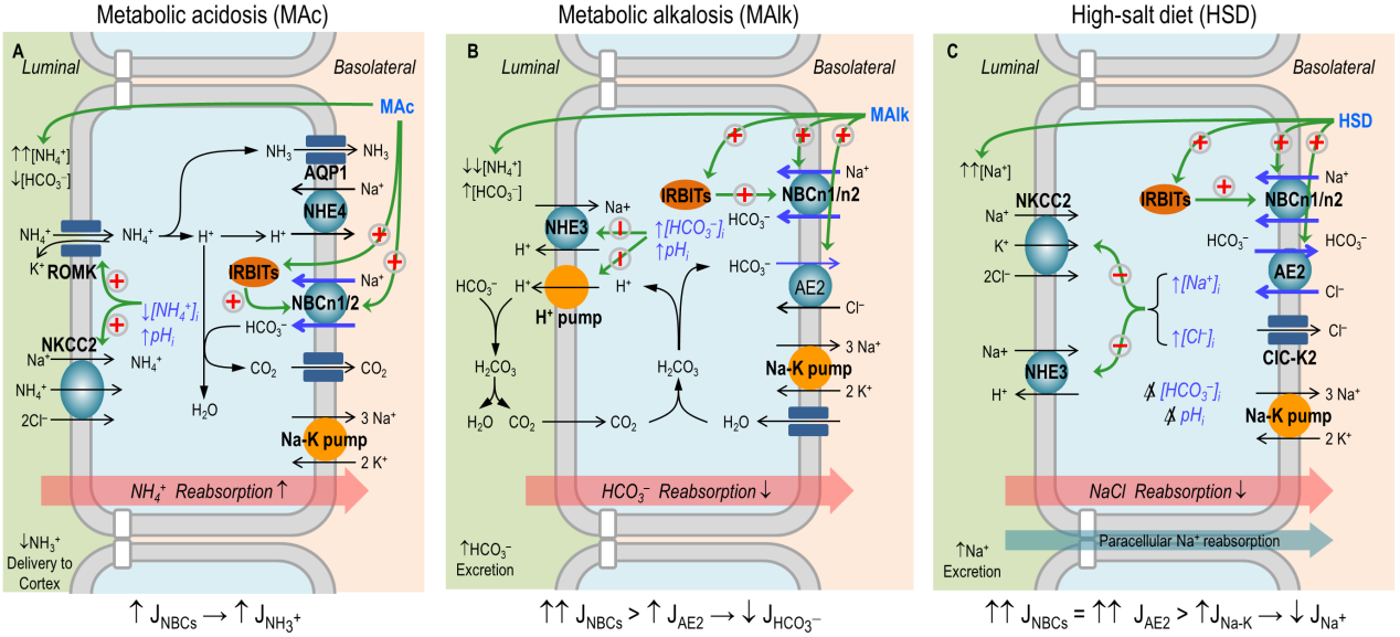 Na+-HCO3–共转运体NBCn1(SLC4A7基因编码)和NBCn2(SLC4A10基因编码)表达在肾小管髓袢升支粗段mTAL上皮细胞的基底侧膜。IRBIT(AHCYL1基因编码)和L-IRBIT(AHCYL2基因编码)是NBCn1和NBCn2的相互作用蛋白。作者们利用非洲爪蟾卵母细胞研究发现,IRBIT和L-IRBIT可以非常强烈地激活NBCn1和NBCn2的活性。饮食中添加的过量的NH4Cl,NaHCO3或NaCl可以显著增强大鼠肾脏mTAL中NBCn1、NBCn2、IRBIT和L-IRBIT的蛋白表达水平。基于研究结果,作者们提出了以下理论:
