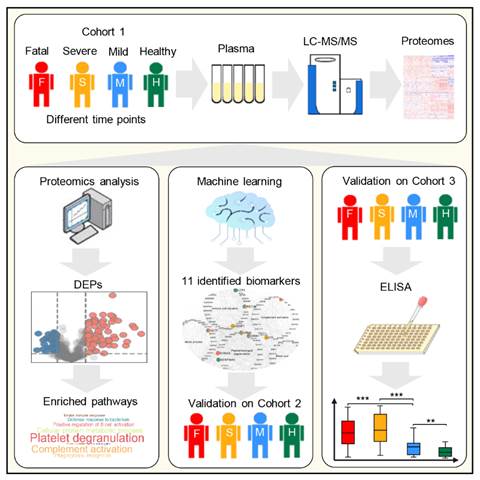 该研究通过对包括非幸存者(死亡者)以及从轻症或重症中康复的幸存者在内的一批新冠肺炎患者的血浆样本进行定量蛋白质组学分析,发现了大量与COVID-19相关的血浆蛋白质的分子变化。此外,基于机器学习算法,开发了名为POC-19 (Prioritization of Optimal biomarker Combinations for COVID-19)的最优新冠标志物组合选择算法,确定了11个可以准确地预测新冠肺炎患者的病情严重程度的生物标志物,其中一组生物标志物被一个独立的血浆蛋白质组队列验证,并在更大规模的队列上通过ELISA实验进一步验证。这些生物标志物包括了在主要病理生理通路中起关键作用的宿主蛋白。这些发现揭示了新冠肺炎的发病机制以及潜在的治疗靶标。