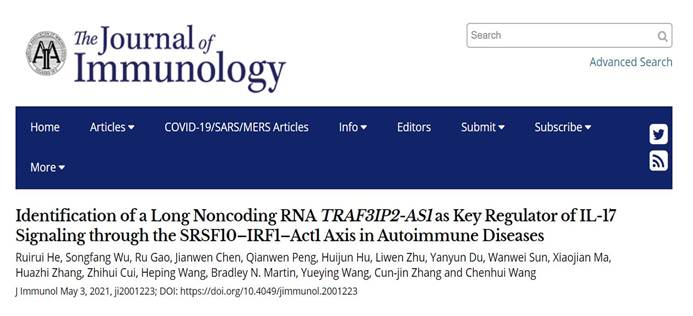 【科研动态】williamhill英国王晨辉教授团队发现长链非编码RNA TRAF3IP2-AS1参与自身免疫疾病的分子机制