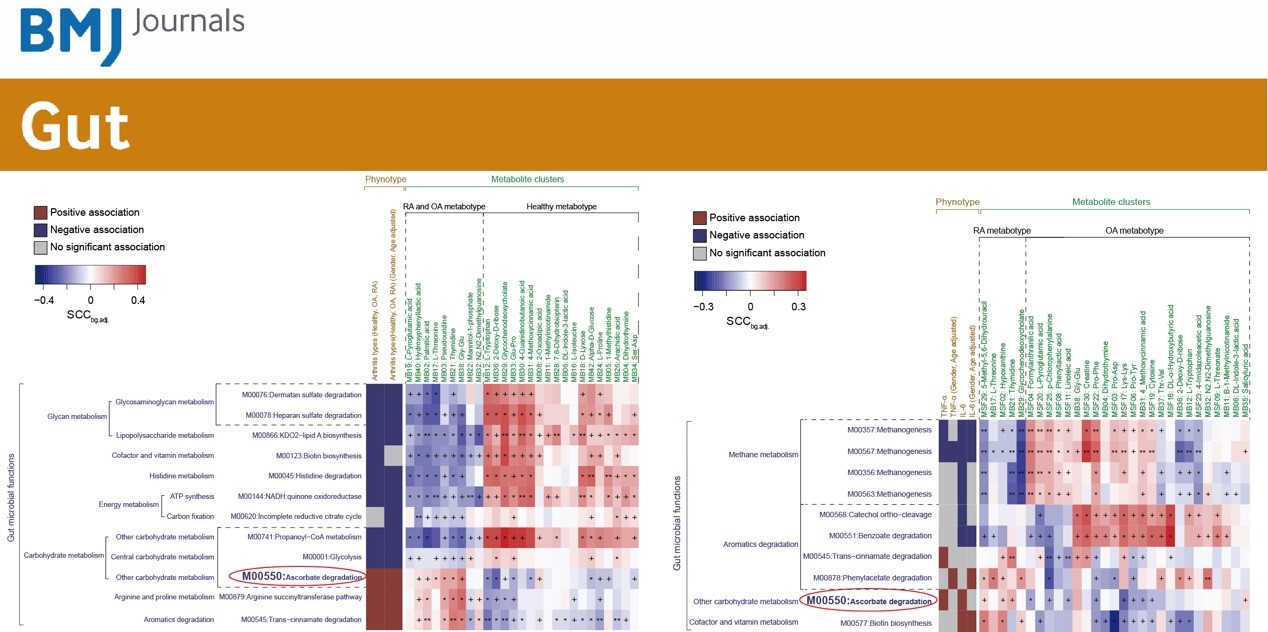 新闻网讯7月13日,近日,我校生命学院宁康教授团队与山东第一医科大学韩金祥教授团队、山东大学张磊教授团队合作,在国际顶级胃肠道期刊Gut在线发表了合作研究的新成果,论文题为《A hidden link in gut-joint axis: Gut microbes promote rheumatoid arthritis at early stage by enhancing ascorbate degradation》。论文共同第一作者为赵燕博士和程铭悦博士,其中程铭悦为我校生物信息学专业20级博士生,共同通讯作者为张磊教授、宁康教授和韩金祥教授。