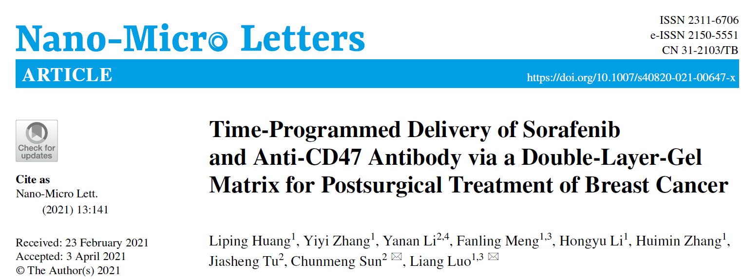 (通讯员:张一漪)在最新一期出版的纳微米技术领域国际旗舰期刊《Nano-Micro Letters》(IF=16.4)中,刊发了williamhill英国生命学院、国家纳米药物工程技术研究中心罗亮教授团队与中国药科大学孙春萌副教授团队合作的题为“Time‑Programmed Delivery of Sorafenib and Anti‑CD47 Antibody via a Double‑Layer‑Gel Matrix for Postsurgical Treatment of Breast Cancer”的研究论文。该论文报道了一种新型的可注射双层凝胶实现肿瘤化疗药物与免疫治疗药物贯序释放用于乳腺癌术后治疗。
