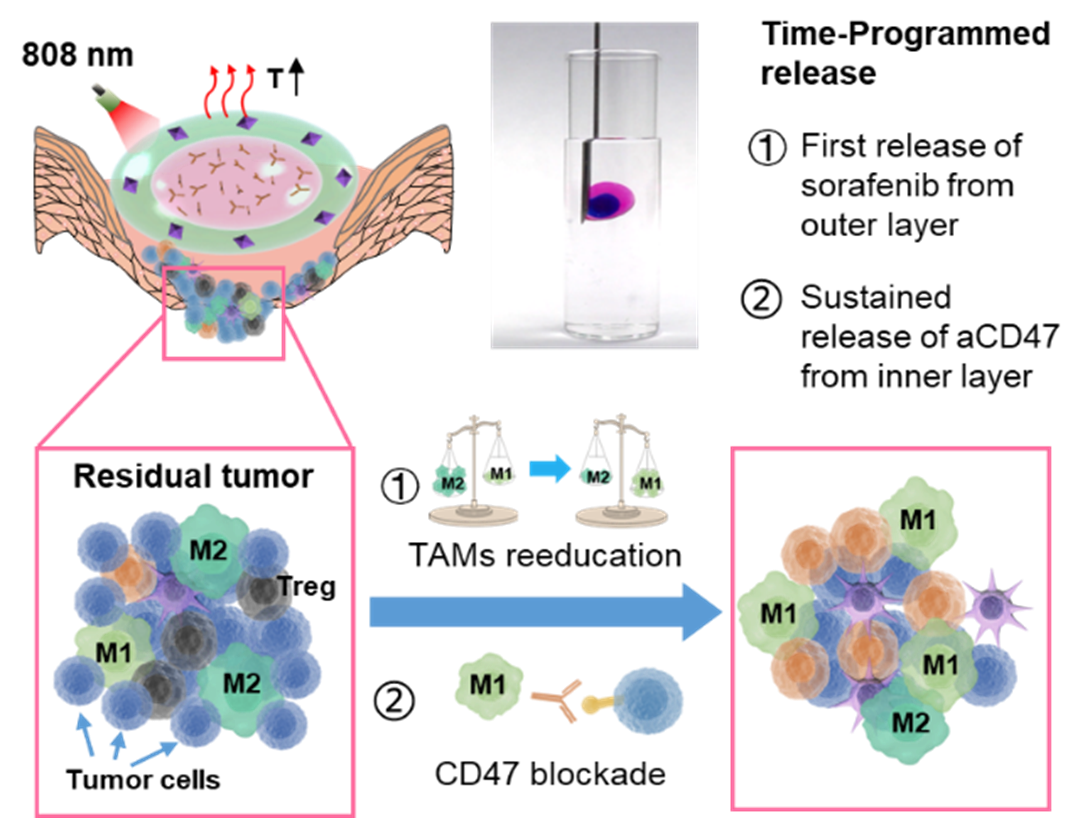 本研究开发了一种新型可注射双层凝胶,实现了基于时空分布的多种药物按需贯序释放,验证了优先释放适宜剂量的化疗药物索拉菲尼能够对肿瘤相关巨噬细胞进行“再教育”并增强抗肿瘤术后免疫治疗的效果,为提升肿瘤免疫治疗临床响应率提供了新思路。