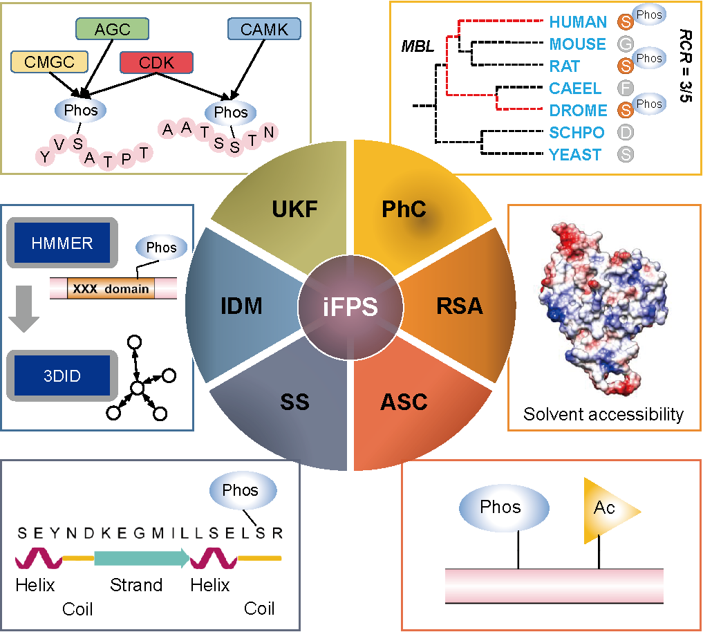 本工作中,薛宇教授团队收集了121个已知的线虫寿命相关的磷酸化位点作为阳性数据后,提取了上述位点的6类特征,包括:1)上游激酶家族数量(UKFs);2)磷酸化保守性(PhC);3)互作功能域(IDMs);4)共发生乙酰化(ASC);5)相对表面可接触性(RSA);6)二级结构(SS)。随后,采用逻辑回归这一经典的机器学习算法构建了功能磷酸化位点预测算法iFPS(inference of functional phosphosites)。结合iFPS算法与蛋白质磷酸化组学数据,本项目共预测了25个潜在的寿命调控相关磷酸化位点,在经过CRISPR/Cas9编辑及Knock-in等实验验证后,成功发现了3个新的寿命调控相关磷酸化位点及其上游调控激酶。进一步的,基于底物磷酸化水平反应上游激酶活性的假设,薛宇教授团队基于DAF-2突变后磷酸化水平下调的磷酸化底物预测了27个潜在的寿命调控激酶,并通过后续实验成功证实了CK2激酶的抑制可促进线虫的寿命。