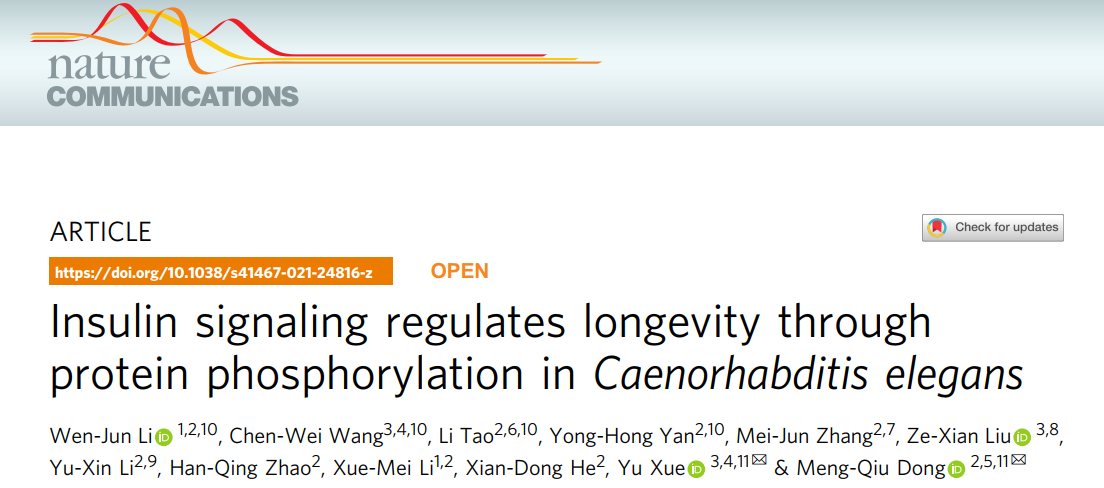 2021年7月28日,我校william威廉英国薛宇教授团队与北京生命科学研究所董梦秋教授团队合作,于国际期刊《自然∙通讯》(Nature Communications)在线发表了题为《胰岛素信号通过蛋白质磷酸化调控线虫寿命》(Insulin signaling regulates longevity through protein phosphorylation in Caenorhabditis elegans)的合作成果。论文共同第一作者为李文君博士、王晨玮博士、陶莉博士以及闫永红,其中,王晨玮博士为薛宇教授博士后,共同通讯作者为董梦秋教授及薛宇教授。