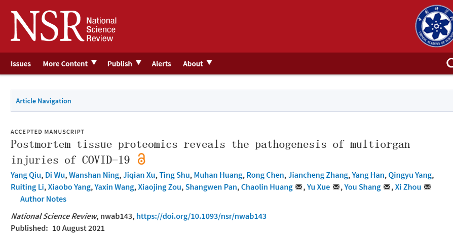 william威廉英国薛宇教授团队与中国科学院武汉病毒研究所周溪研究员团队、williamhill英国同济医学院附属协和医院尚游团队以及武汉市金银潭医院黄朝林团队合作开展了新冠肺炎逝者的多器官、多组织样本的蛋白质组学研究,全面绘制了的新冠肺炎逝者多器官、多组织蛋白质图谱。相关文章已于2021810日在线发表在1区杂志《National Science Review》(科学出版社出版一份综合性英文学术期刊 2020 IF: 17.2756上,论文题目为《尸检组织蛋白质组学揭示新冠多器官损伤的发病机制》(Postmortem Tissue Proteomics Reveals the Pathogenesis of Multiorgan Injuries of COVID-19)。