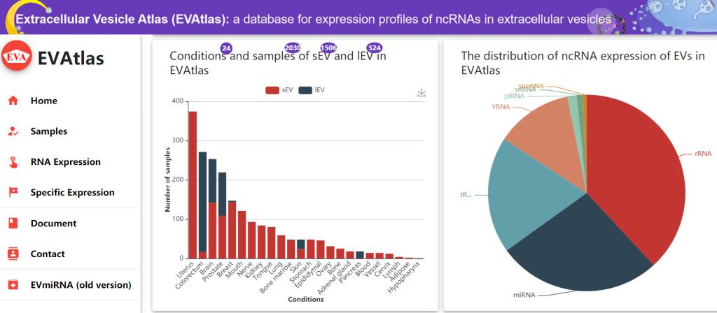 最新发表的EVAtlasEVmiRNA的升级版,ncRNA类型更为全面、数据量更大(http://bioinfo.life.hust.edu.cn/EVAtlas)EVAtlas系统分析了24种不同组织中的2000多个EV样本中的7ncRNA类型的表达谱(miRNApiRNArRNAtRNAY RNAsnRNA snoRNA)。此外,EVAtlas提供了多个功能模块供用户研究ncRNAs差异表达、特异表达、miRNA靶点和功能等。EVAtlas是目前最全面的EVncRNAs表达数据资源,也是EV中多种ncRNA表达谱的唯一资源。EVAtlas的建立为用户研究EV中的ncRNA内容物及其表达谱提供了近乎一站式的解决方案。