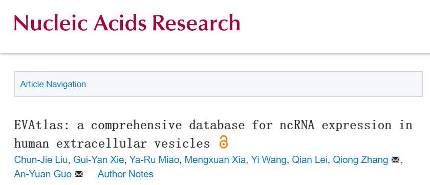 非编码RNAncRNA)是细胞外囊泡(EV)中的重要分子成分,在EV功能和细胞间通讯中起着重要作用,也可以作为生理和病理状态的候选生物标志物。因此,对EVncRNA的系统研究,有助于全面和深入了解EV功能及其内含物,发现关键功能分子和标志物。郭安源团队于2018年发布了EVmiRNA数据库,专注于EVmiRNA的表达及其潜在功能,广受欢迎,其论文(Nucleic Acids Research 2019)被评为高被引论文。