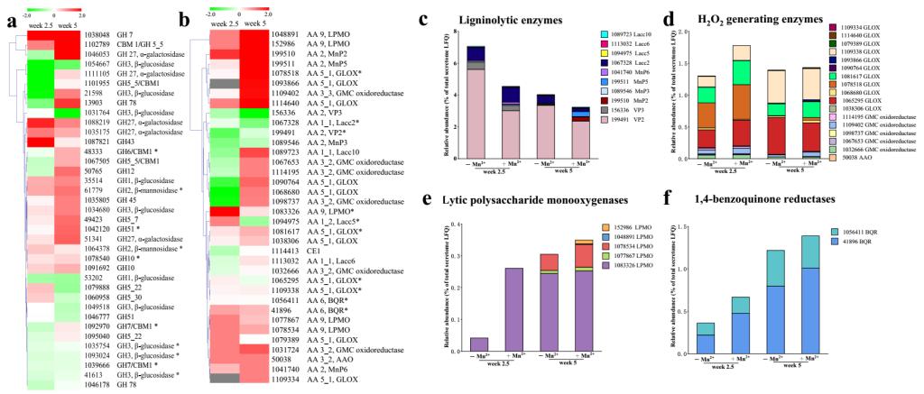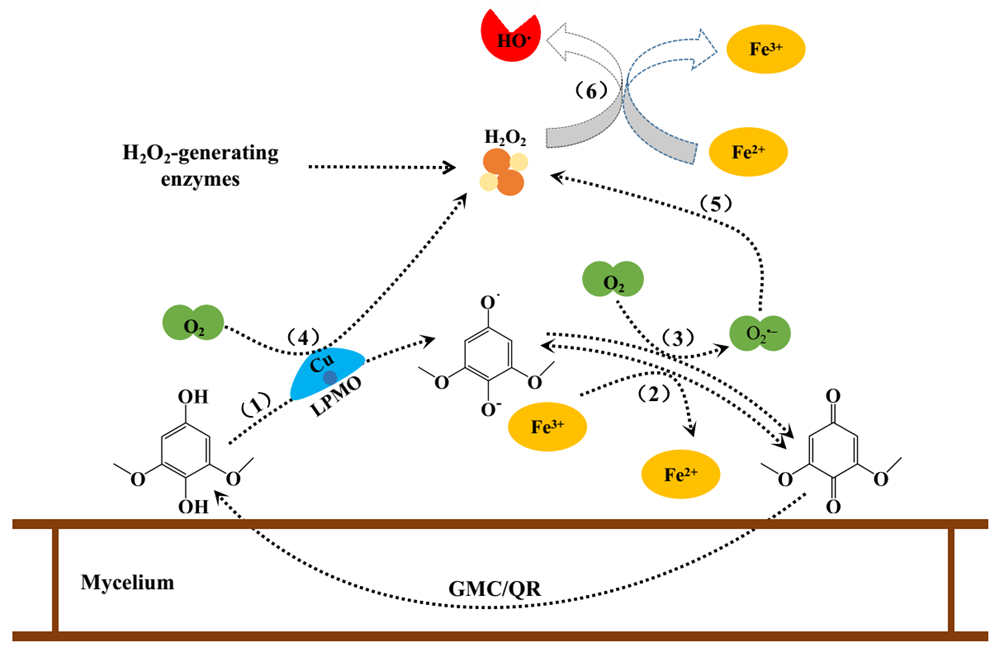 秸秆、木材等木质纤维素类生物质是地球陆地生态系统中最丰富的可再生资源,木质纤维素的生物降解转化对维持全球碳循环和生物炼制产业的发展具有重要作用。裂解性多糖单加氧酶 (Lytic polysaccharide monooxygenase,LPMO) 广泛分布于真菌、细菌、古菌和昆虫中,因其多样化的多糖氧化裂解功能而备受关注。本研究中,研究人员结合木质纤维素超分子结构表征和差异蛋白质组分析技术,揭示了LPMO在木腐菌Pleurotus ostreatus降解非多糖底物中的新作用。研究首次发现LPMO通过醌氧化还原循环途径增强胞外Fenton反应,进而氧化断裂木质素(Lignin)和木质素—碳水化合物复合物(Lignin-Carbohydrate Complexes,LCC)内部的交联结构,降低木质纤维素的转化抗性,实现其高效生物转化。该发现进一步拓展了LPMO的生物学功能,对明晰木腐菌胞外氧化还原酶协同转化木质纤维素的机制具有重要意义。