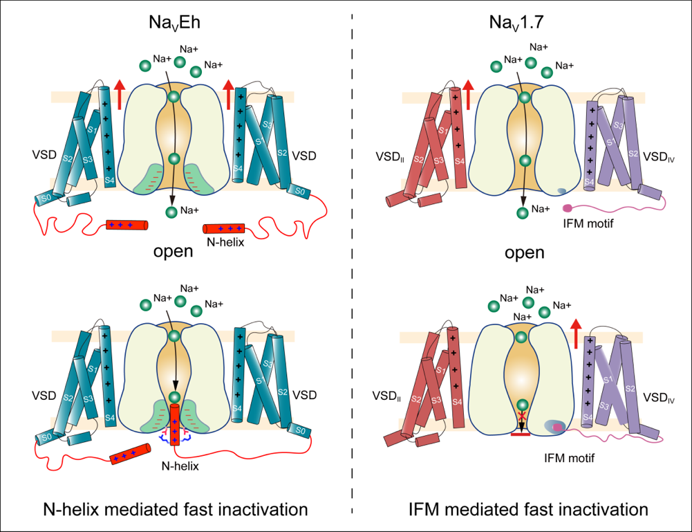 真核生物的钠通道通常会在几毫秒内快速失活。目前真核钠通道结构研究表明,人源钠通道的Ile-Phe-Met (IFM)基序可作为一个疏水性闩锁,以变构方式关闭激活门。相比之下,同源四聚体原核钠通道缺乏IFM基序,也没有快失活机制,而是具有数百毫秒内的缓慢失活。从进化的角度来看,在原核钠通道的慢失活和真核钠通道的快失活之间缺失了一环。