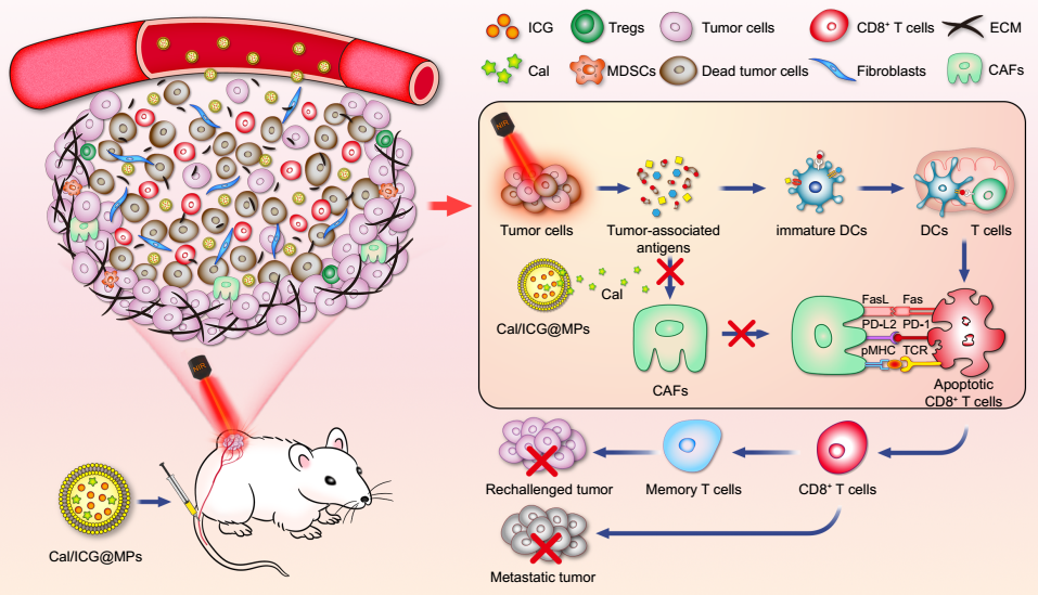 该研究设计、构建了肿瘤细胞来源的微颗粒共包载光敏剂ICG和CAFs去激活剂卡泊三醇(Cal)。该载药微颗粒(Cal/ICG@MPs)能有效靶向基质丰富的肿瘤组织,显著调控CAFs功能,重塑肿瘤胞外基质,促进ICG肿瘤组织富集并深部渗透,改善光热治疗效果;Cal/ICG@MPs产生的光热效应可诱导肿瘤细胞免疫原性死亡(ICD),促进DCs成熟及CD8+ T细胞激活,且通过Cal/ICG@MPs对CAFs改造实现CD8+ T细胞肿瘤组织招募和深部渗透,并削弱CAFs吞噬光热诱导的肿瘤抗原后所激活的AICD效应,使CD8+ T细胞在肿瘤组织增殖,产生强的抗肿瘤免疫反应,并改善肿瘤免疫抑制微环境,形成长期的抗肿瘤免疫记忆。在多种荷瘤动物模型(肝癌皮下大肿瘤、乳腺癌原位双侧瘤、乳腺癌肺转移模型)抗肿瘤实验中均证实,Cal/ICG@MPs通过调控CAFs功能显著改善光热治疗效果,有效抑制肿瘤的复发与转移。该研究不仅改善光热治疗效果,也为提高其他治疗,如化疗、放疗、免疫治疗等疗效提供新思路。
