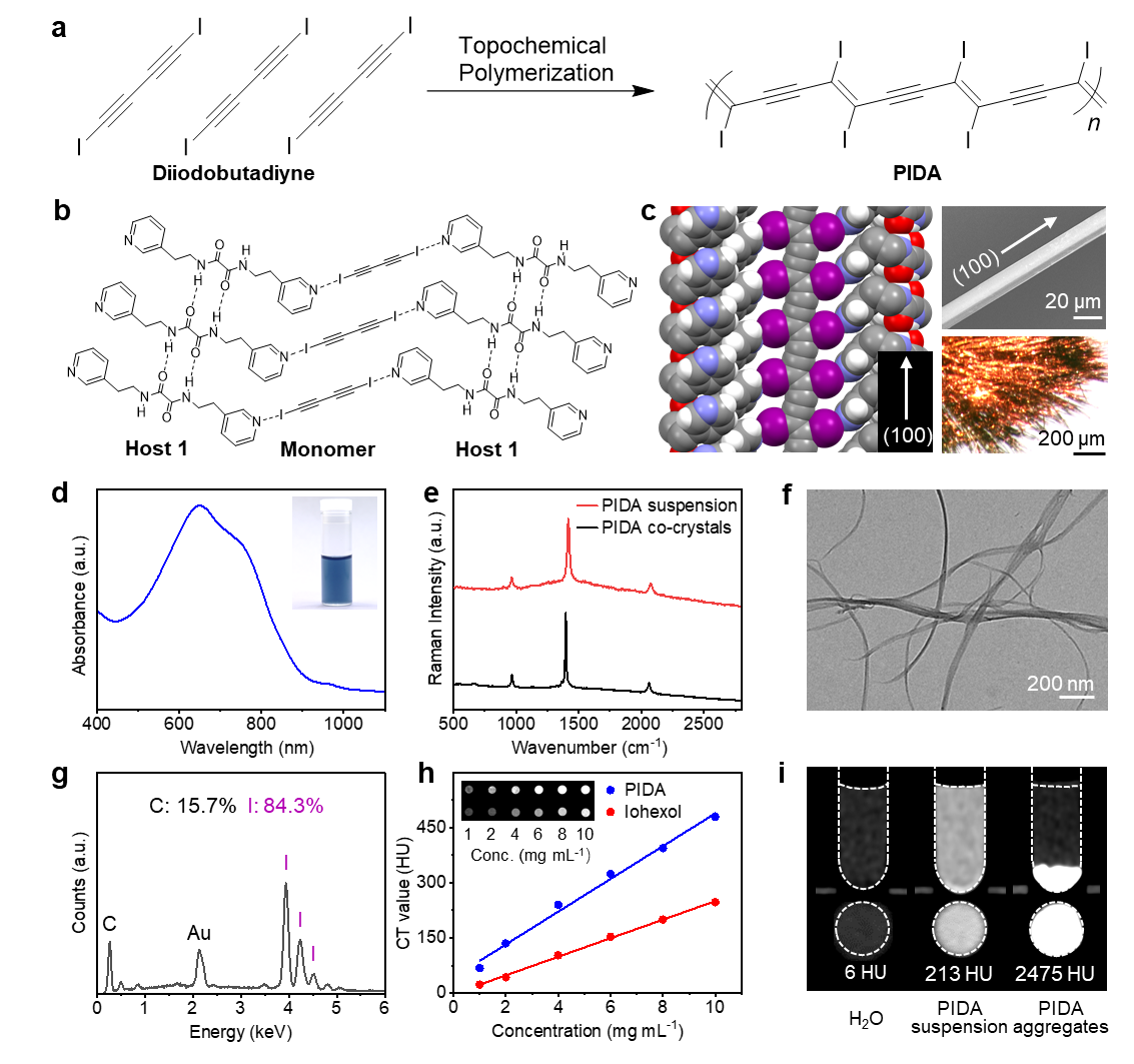 在这项研究中,研究人员首先将单体diiodobutadiyne与模板分子进行适当的空间排列组装,通过拓扑化学聚合制备了一种仅由碳碘组成的共轭高分子PIDA。PIDA具有超高含碘量 (>84 wt%) , 可赋予其前所未有的X 射线衰减能力。并且PIDA可形成纳米纤维,其在水介质中的CT信号表现出聚集诱导放大效应,可进一步增大10倍以上。