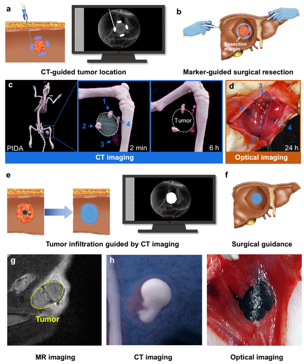 计算机断层扫描 (CT) 是目前最常用的疾病诊断和治疗引导技术之一,基于CT造影剂的增强CT可以精准鉴定微小肿瘤病灶,然而依据CT造影结果在肿瘤手术切除时精确界定肿瘤切缘却十分困难。大多数碘造影剂的清除速度过快导致有效性不足,而金属造影剂则受到强烈的成像伪影干扰并具有生物安全问题。此外,绝大部分CT造影剂肉眼难以识别,因而严重限制了手术过程中对肿瘤边缘轮廓的界定。如何将CT诊断结果精准、实时地转化为治疗干预是目前亟需解决的重大临床问题。