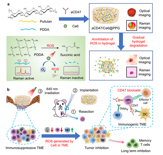 罗亮教授团队前期报道了一种可在活性氧作用下完全降解的共轭高分子聚二炔衍生物PDDA(J. Am. Chem. Soc. 2021, 10054),其降解产物主要为生物相容性极佳的丁二酸。在此工作基础上,该团队进一步将PDDA与普鲁兰糖交联制备得到一种活性氧响应型凝胶,并负载光敏剂Ce6与ICB抗体aCD47。在PDT的过程中,负载于凝胶内的Ce6所产生的活性氧易与共载的抗体反应,破坏抗体结构,降低抗体活性。此时,作为凝胶骨架之一的PDDA能够有效清除凝胶内的ROS从而保护aCD47的活性;而且PDDA能够在清除活性氧的同时发生降解,进而触发凝胶降解,实现光敏剂和抗体的可控精准释放。