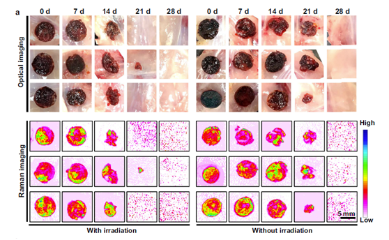 此外,该团队前期工作还表明,PDDA在“细胞拉曼沉默区”(1800-2800cm-1)具有超强的拉曼信号,其单位强度可达一般小分子探针的105倍以上(Nat. Commun. 2020, 81;Nano Lett. 2022, 4544)。同时,PDDA的拉曼信号强度与其降解程度正相关,因此,可通过拉曼成像监控该活性氧响应型凝胶的体内降解与ROS的消耗情况。