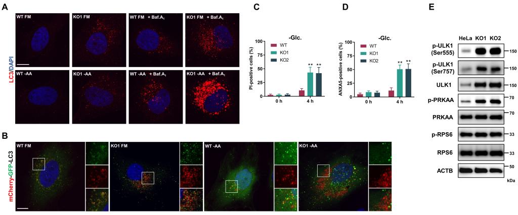 图1:RAB21敲除细胞自噬流升高,饥饿条件下凋亡率升高,AMPK通路活化,ULK1蛋白水平及磷酸化增加