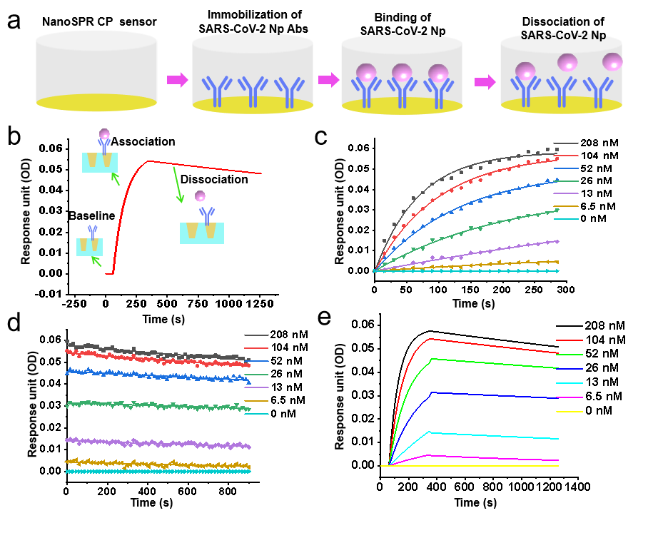 图2(a) SARS-CoV-2 Nucleocapsid Protein (Np)检测示意图。(b)固定SARS-CoV-2 Np抗体的传感器检测104 nM SARS-CoV-2 Np的结合与解离实时曲线图。SARS-CoV-2 Np抗体与不同浓度SARS-CoV-2 Np(0-208nM)之间的结合动态拟合曲线(c),解离动态拟合曲线(d)和结合解离动力学曲线(e)。