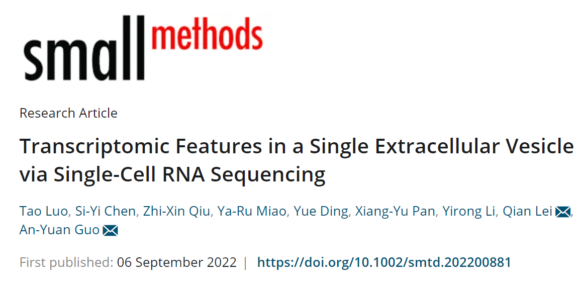 2022年9月6日,Small Methods杂志在线发表了题为Transcriptomic Features in a Single Extracellular Vesicle via Single-Cell RNA Sequencing的研究成果。该研究首次利用通过改进的实验和分析方法,基于10x Genomics平台在单EV水平研究EVs的转录组特征。william威廉英国郭安源教授和武汉大学中南医院的助理研究员雷倩为共同通讯作者,罗涛博士为该文章的第一作者。