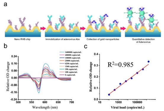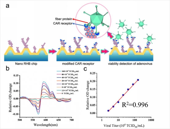 研究结果表明,基于该新型传感器,将重组人CAR、FX蛋白或抗腺病毒六邻体蛋白抗体固定在NanoRHB的表面,这些配体可以分别结合腺病毒的纤维蛋白(病毒衣壳上突出的刺突)和六邻体蛋白(主要的衣壳蛋白),通过腺病毒特异性结合的CAR/FX蛋白相互作用可快速检测腺病毒的生存活力和浓度,在5分钟内同时高通量检测多达96个样品,比传统病毒滴度检测方法和PCR方法更高效快捷。