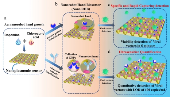 针对上述问题,williamhill英国刘钢教授和黄丽萍博士团队与华中农业大学金梅林教授与张强教授团队合作研发了一种具有纳米级多功能机器人手结构的纳米等离子体(Nano RHB)生物传感器,用于快速、无损和特异性地捕获和定量检测腺病毒颗粒。该传感器可应用于实时监测病毒疫苗载体数量和质量,评估病毒疫苗载体的感染活力。