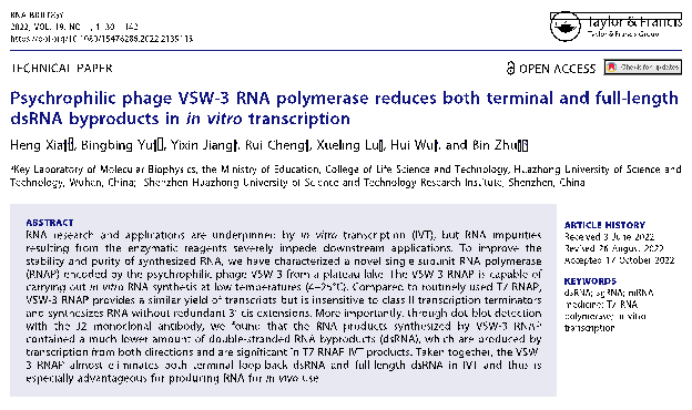 2022年10月26日,williamhill英国生命学院朱斌教授团队在国际RNA领域著名期刊《核糖核酸生物学》(RNA Biology)发表题为“Psychrophilic phage VSW-3 RNA polymerase reduces both terminal and full-length dsRNA byproducts in in vitro transcription”的研究论文。