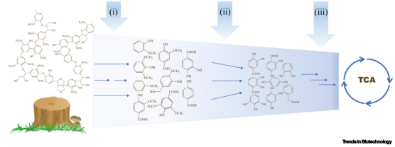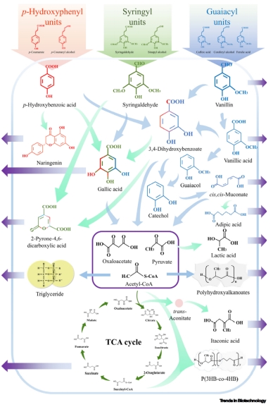 木质素约占木质纤维素的20-30%, 主要由愈创木基丙烷、紫丁香基丙烷、对羟苯基丙烷3种苯丙烷单元通过醚键和碳碳键相互连接形成。由于其异质性及复杂性,使其高值化利用变得十分困难。目前,木质素的高值化利用主要存在两种策略:一是利用木质素的高分子特性合成先进高分子材料(如碳纤维、生物泡沫塑料等);二是将木质素解聚成芳香族单体或低聚物,再进一步转化为高值目标化学品。在自然界中,许多微生物已进化出十分智能的“生物漏斗”模式来高效转化木质素,这些微生物不仅具有天然的胞外协同酶可高效解聚木质素,同时还利用不同的芳烃代谢途径来将复杂的木质素解聚后芳香族混合物转化成相对单一的化学物质。这些方面的研究为利用合成生物学手段实现木质素的定向转化提供了基础。
