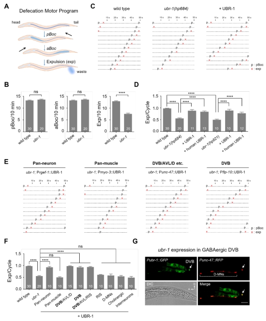 研究发现ubr-1 突变体线虫不仅有运动缺陷[4],排便行为也出现异常。线虫排便运动程序是一种节律行为,正常培养环境中野生型线虫排便行为每45-50秒发生一次(图1 A)。行为学结果显示ubr-1 线虫排便过程中肠道内容物释放(Exp)频率明显降低(图1 B),基因回补实验证实 UBR-1蛋白功能保守,同时调控节律性排便,UBR-1功能缺失导致Exp频率下降(图1 C,D)。进一步的组织特异性回补实验结合荧光共定位数据(图1 E-G)确定了UBR-1作用在兴奋性GABA能DVB神经元中调控Exp过程。