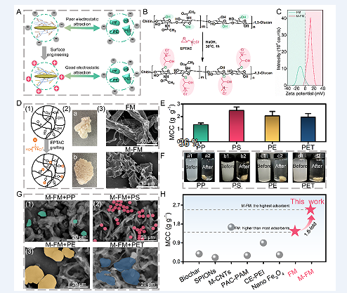 微塑料是一种粒径小(<5mm)、性质稳定、难降解、易吸附有害物质和微生物的新型污染物,广泛分布于湖泊、河流、海洋、土壤中,可沿食物链传递和富集,严重危害生态系统和人类健康。微塑料污染已成为全球环境与生态科学研究领域的重大科学问题。本研究利用白腐真菌快速生长形成的自组装菌丝体材料(FM),通过物理捕获和化学吸附实现聚丙烯(PP)、聚苯乙烯(PS)、聚乙烯(PE)、聚对苯二甲酸乙二醇酯(PET) 四种常见微塑料的富集,最高吸附率达到0.8 g/g,为当前同类吸附材料的最高水平。在此基础上,针对真实水体中菌丝体与微塑料颗粒间的静电排斥阻碍两者相互作用的难题,进一步利用2, 3-环氧丙基三甲基氯化铵 (EPTAC)调节菌丝体胞外聚合物(EPS)的表面电荷。经过表面工程化改性的真菌菌丝体(M-FM)对四种微塑料的吸附能力大幅度提升,其中对PS的吸附率达到创纪录的2.49 g/g,是当前已报道微塑料吸附剂的1.5到12.5倍。