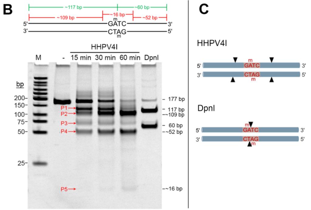 朱斌课题组通过分析Dpn I识别m6A的机制,根据有限的结构域同源性线索从近年来爆发性增长的环境微生物基因组中发掘可能识别m6A的新型工具酶,意外发现一种古菌病毒编码的未知功能蛋白质HHPV4I具有可能识别m6A的结构域,但总体序列与结构与DpnI差异较大。通过对重组蛋白质的详尽生化和酶学分析,课题组发现HHPV4I确实是一种新颖修饰依赖限制性内切酶,并展示了HHPV4I的识别与切割特异性。HHPV4I与DpnI一样专一识别Gm6ATC修饰序列,但切割方式截然不同:DpnI在Gm6ATC位点中央进行切割,产生两个DNA平末端;而HHPV4I在Gm6ATC位点两侧一定距离处同时切割,将包含位点在内的短DNA片段切出。进一步发现HHPV4I识别m6A的结构域中的点突变可以改变识别序列的专一性。