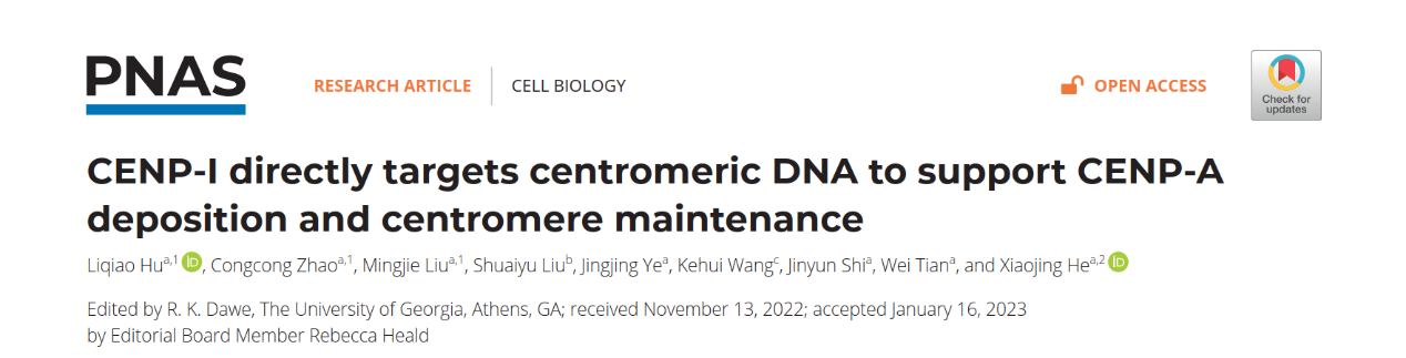 2023年3月8日,贺晓静课题组在PNAS杂志(Direct Submission)上在线发表了题为 CENP-I directly targets centromeric DNA to support CENP-A deposition and centromere maintenance 的研究论文,揭示了动粒核心亚基CENP-I识别着丝粒DNA进而维持新合成CENP-A初始定位的分子机制与重要功能。