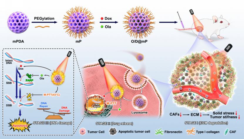 针对以上乳腺癌治疗中面临的困境,本工作使用简单的策略将奥拉帕利(一种已经被批准用于临床的PARP抑制剂)和阿霉素(一种典型的DNA损伤化疗药物)共同载入聚乙二醇修饰的介孔聚多巴胺纳米粒中,以治疗HR健全的三阴性乳腺癌(图1)。在这一纳米载药系统中,介孔聚多巴胺不仅作为药物载体,而且作为光热产生器。我们发现介孔聚多巴胺产生的局部温和光热效应(M-PTT,43 ℃左右)能够通过大幅降低HR相关蛋白MRE11、RAD51和BRCA2的表达来抑制HR修复途径。同时,体内实验结果表明,M-PTT可以通过缓解乏氧以有效抑制肿瘤相关成纤维细胞(CAFs),并减少乳腺癌致密细胞外基质(ECM)。此外,ECM的减少使肿瘤力学和肿瘤血管正常化,提高药物在肿瘤部位的富集和渗透。因此,在M-PTT的帮助下,这种纳米载药系统能够诱导强有力的DNA损伤,从而增强抗肿瘤疗效,同时最大限度地减少全身副作用。这项工作突出了M-PTT对DNA损伤修复功能的抑制和对肿瘤力学的改善。考虑到M-PTT是一种安全、特异且非侵入性的辅助治疗策略,这种具有光热性能的纳米载药系统在未来的临床治疗中具有广阔的应用前景。