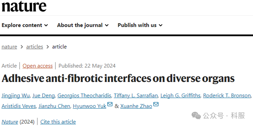 2024年5月22日,美国麻省理工学院机械工程系赵选贺教授团队在Nature期刊发表题为“Adhesive anti-fibrotic interfaces on diverse organs”的研究论文,团队博士后吴晶晶为论文第一作者,Hyunwoo Yuk博士、赵选贺教授为论文共同通讯作者。