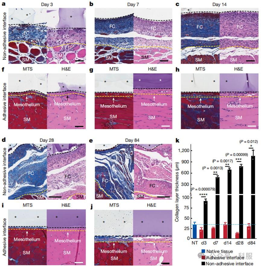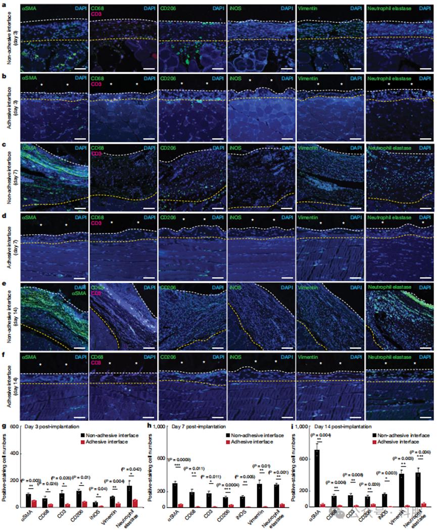 图3. 不同时间点粘附和非粘附植入物-组织界面的免疫荧光分析