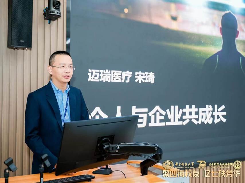 进入校友发展报告环节,2004级校友,武汉迈瑞科技总经理宋琦带来报告《个人与企业共成长》。他详细介绍迈瑞企业的发展情况,迈瑞作为中国医疗设备企业领航者,在生命信息与支持、体外诊断与医学影像三大传统主营业务领域全球领先,疫情期间发挥了重要力作用。他提出守护全人类健康的愿景,期望能加强校企交流合作,吸揽更多优秀人才。