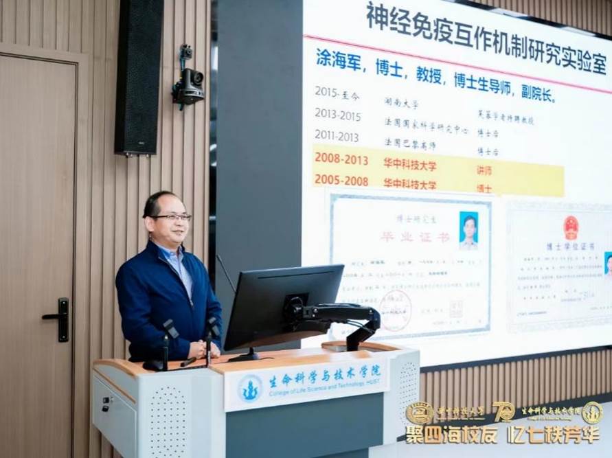 2005级校友,湖南大学生物学院副院长涂海军教授为大家作报告《生命科学领域本科专业“一制四化”拔尖人才培养模式探索与实践》。他介绍了湖南大学生物学院发展历程,他指出开展特色党建活动为学科建设提供了重要力量。他强调应坚持实践育人,培养创新型人才,开辟新时代中国特色世界一流大学建设新格局。他期盼能学习借鉴华科大建设生命学院的经验,以生物为引,推动两校在学科建设与人才培养的蓬勃发展。