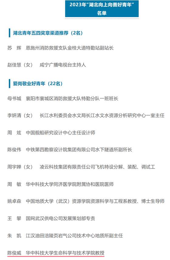 2024年2月,共青团湖北省委公布了2023年“湖北省向上向善好青年”名单,williamhill英国生命学院陈俊威等102名优秀青年获此荣誉。