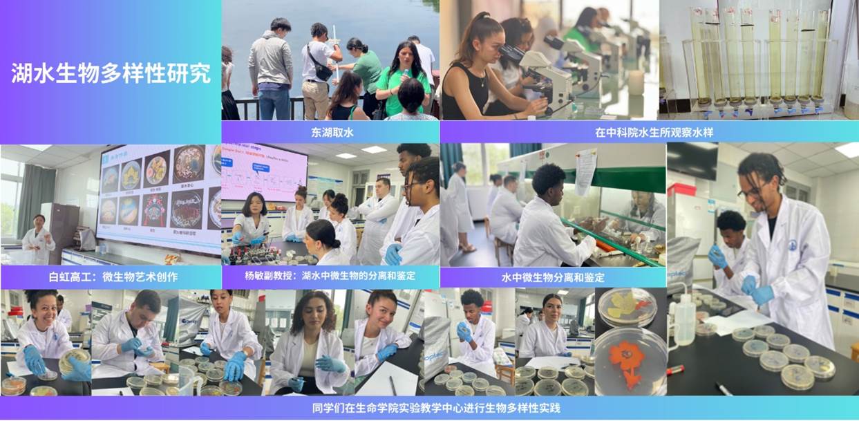 生物多样性是人类生存和发展的基础,也是本次学习的重要主题。在中科院水生所周巧红研究员团队的带领下,同学们在碧波荡漾的东湖之滨采集水样,并在水生所实验室对所采集养本进行观察;在白虹高工和杨敏副教授的指导下,分离和鉴定湖水中的微生物,并在超净工作间开展涂布及微生物绘画实验。同学们灵感无限,以培养皿为画布开展创作,对生物多样性的理解在采集-观察-创作的沉浸式学习中深化。