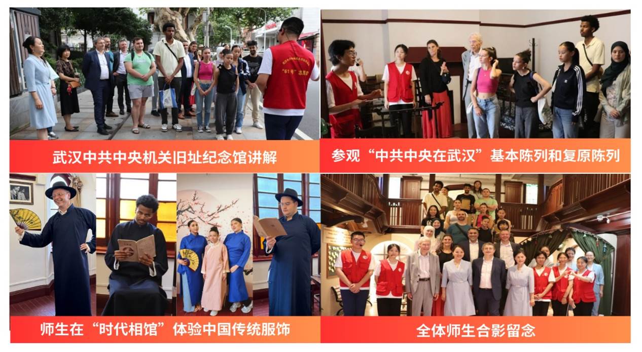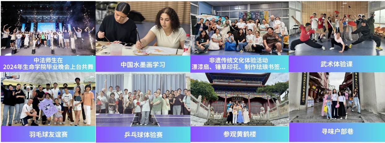 在文化体验上,同学们参加了生命学院2024届毕业晚会,中法师生上台共舞,其乐融融;在中国非物质文化遗产体验系列活动中,中法师生品茗茶、漂漆扇、锤草印花、初探国画、首练武术,体会中华文化的博大精深;在羽毛球友谊赛上展开切磋,增进友谊,并在球衣上签名留念;在乒乓球友谊赛上,法方学生向生命学院的同学们学习握拍和发球要领,并邀请埃夫里-巴黎萨克雷大学校长Vincent BOUHIER教授参与比赛;在红色之旅特别活动中,同学们参观武汉中共中央机关旧址纪念馆,聆听中国革命先烈无私奉献的故事,体验传统服饰文化,漫步黎黄陂路历史文化风貌街,亲身感受到了武汉这座英雄城市的历史底蕴。