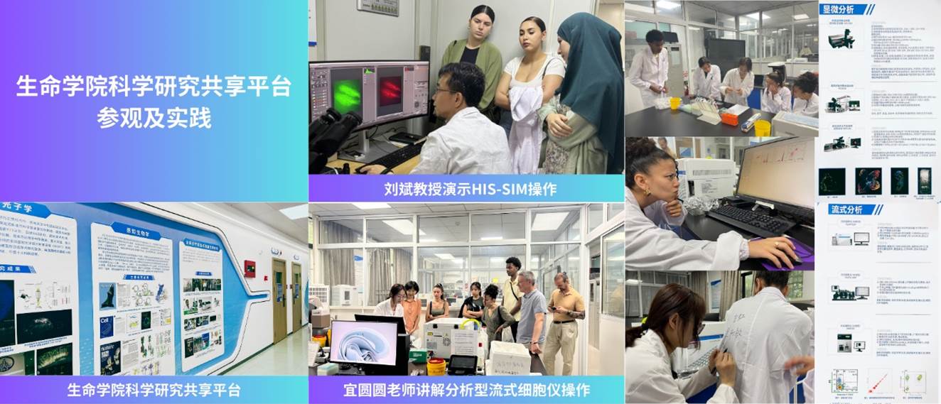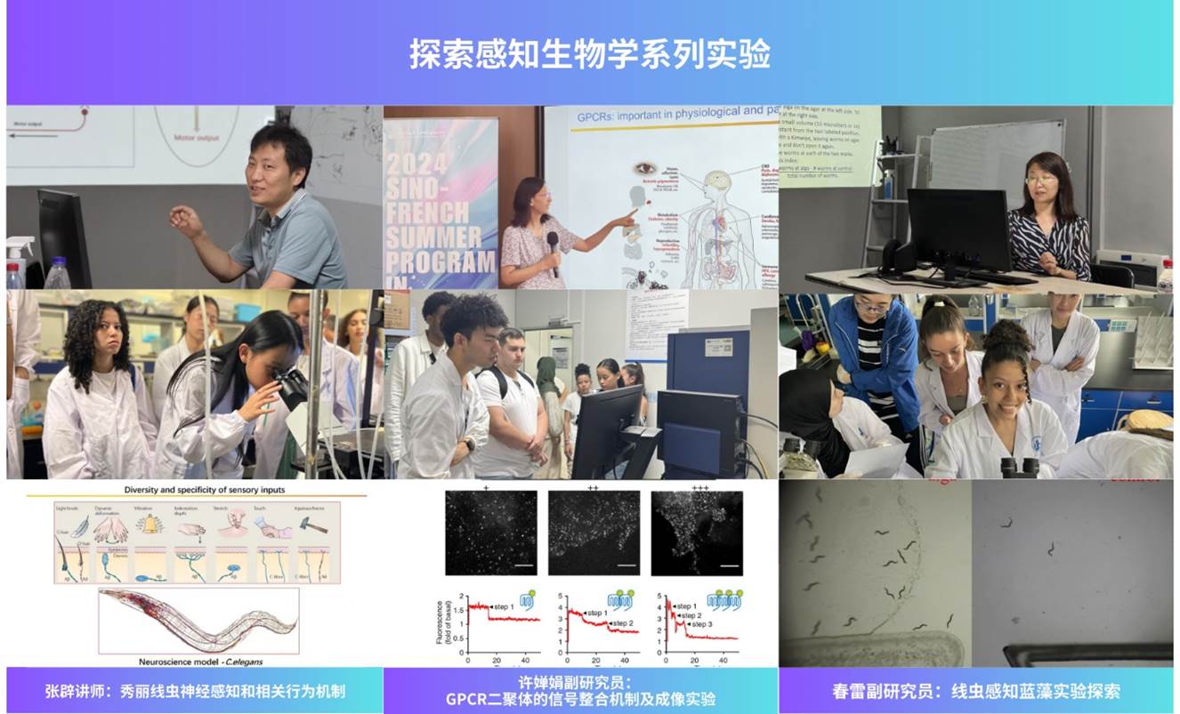 在科学实验方面,在多位资深教师的悉心引领下,同学们接触到了多种的先进的实验技术,并先后8次走进学院虚拟仿真实验教学中心和科研共享平台亲自操作。许婵娟副研究员讲解了GPCR相关前沿研究并演示了钙信号成像实验;张辟讲师阐释了采用秀丽线虫作为模式生物的神经感知生物学研究;跟随春雷副研究员的指引,实操学院中法iGEM战队银奖项目——线虫感知蓝藻实验。在学院科研共享平台,在宜原原老师的带领下,全面熟悉了实验平台的各项设施与资源;与刘斌教授学习使用流式细胞仪,并观看SIM成像实验演示。Kenan OGGAD同学表示,这段实验与实践的宝贵经历,不仅让他收获了来自实验中心师生团队的温暖帮助与专业指导,更在每一次动手操作与科学探索中激发了诸多启发,留下了深刻印象。
