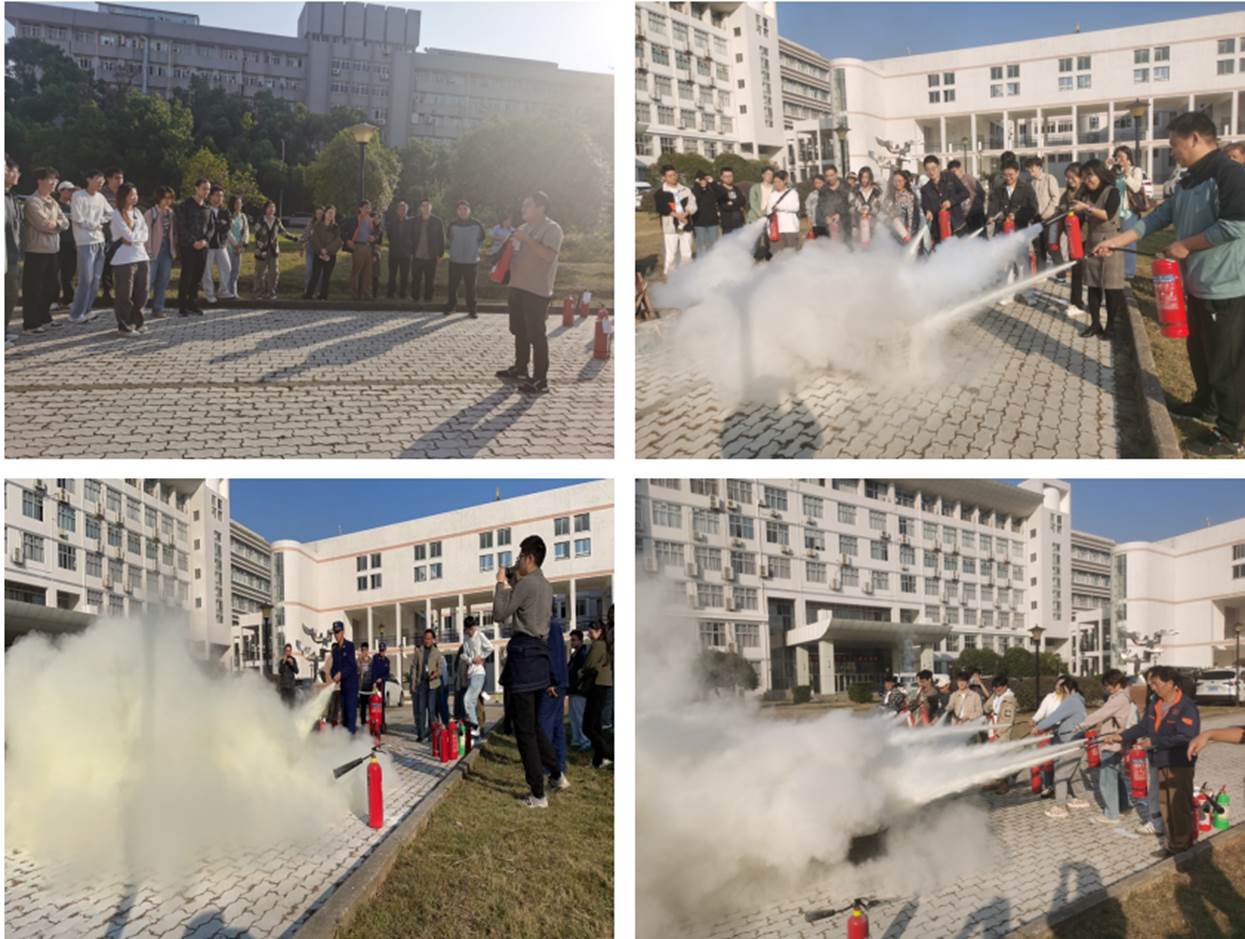 随后,在东十二楼前广场开展了灭火器实操演练,陈军、吴颖等示范了灭火器“一提、二拔、三握、四压”的使用方法。接着,同学们纷纷上前,亲自体验使用灭火器灭火的过程。在消防人员的指导下,师生们手持灭火器,对准火源根部,迅速将火扑灭。通过实际操作,师生们不仅掌握了灭火器的使用方法,还提高了应对突发火灾的能力。