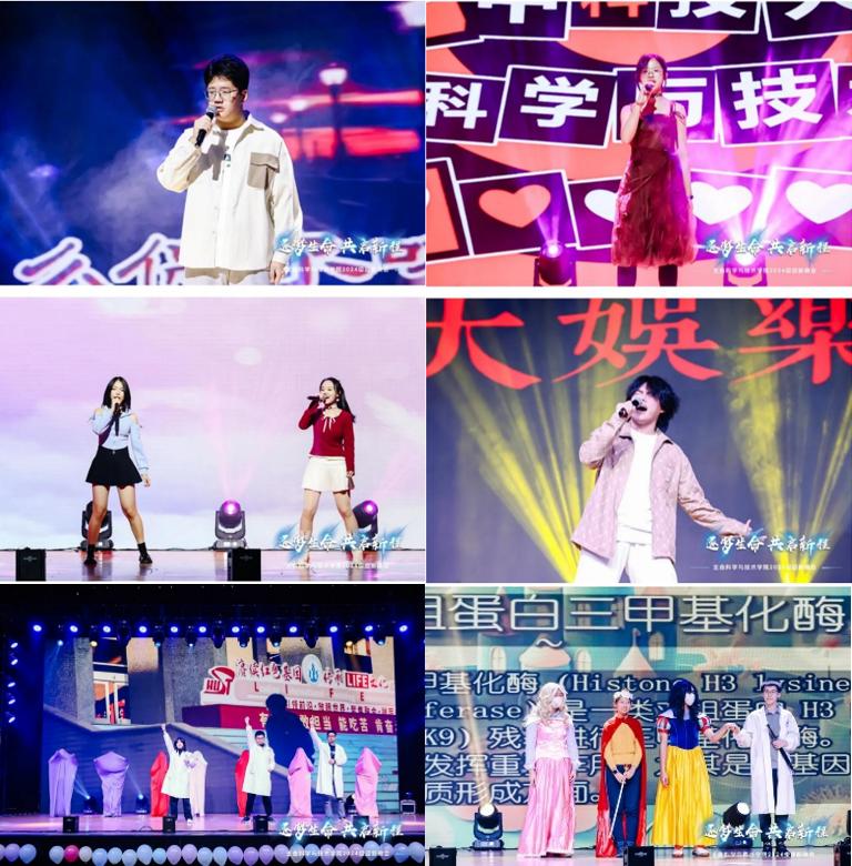 主持人宣布晚会正式开始,歌曲串烧《像我这样的人 & 燃烧吧青春 & life will change & 浮夸》瞬间点燃了全场的气氛。紧接着,由登峰2401班带来的《微观战场》用精湛的演技、独特的视角将微观世界的战斗淋漓尽致地呈现在观众眼前,演绎了一个神秘又充满刺激的微观天地。生贝2401班的《遗传学达拉崩吧》巧妙地将遗传学知识与热门歌曲《达拉崩吧》结合在一起,用轻松幽默的方式传播知识,为整个晚会增添了别样的趣味。